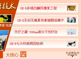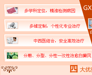 白癜风诊疗前沿技术——GX-B多维白癜风康复工程,在白癜风医疗领域中实现了“绿色、安全、高效”的全新突破。一、倡导世界卫生组织提出的绿色疗法理念,从白癜风患者的根源入手,实现自然治愈的新健康目标;二、标本兼治,结合抗复发中成药治疗白癜风,治愈率与效率同高;三、针对个体不同的病因,辨证施治,确保成功治愈。